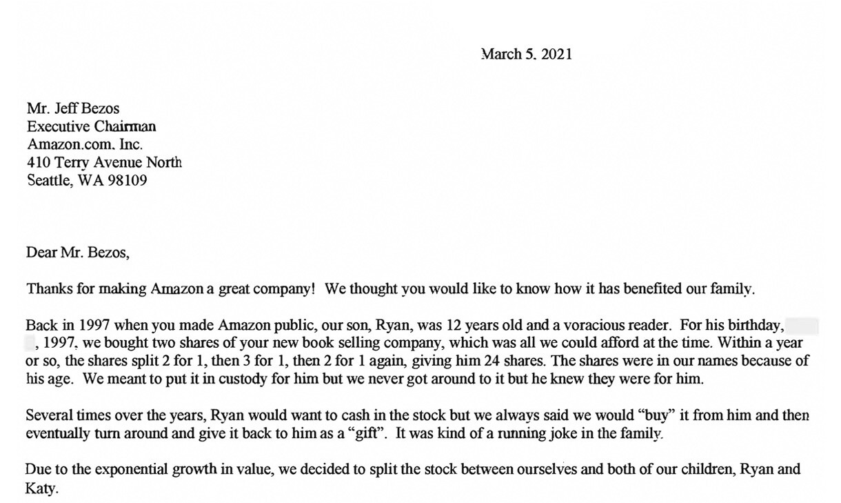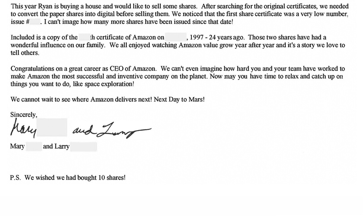 Bezos starts his 2020 letter with a napkin math calculation of the value that Amazon created - 300 Billion. And then he attaches a personal letter from a couple about how 2 Amazon shares from 1997 affected their family - positively.